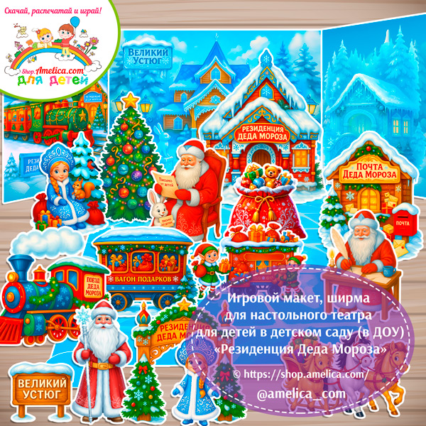 Макет игрового пространства, ширма для настольного театра для детей для детского сада (ДОУ) «Резиденция Деда Мороза» шаблон скачать и распечатать