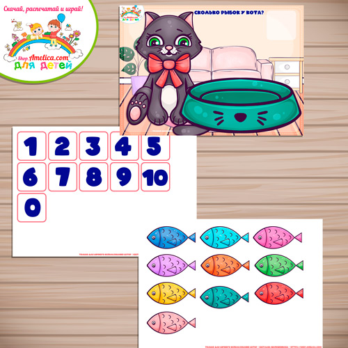 Математическая игра для малышей «Сосчитай рыбок у кота!» шаблон скачать для распечатки