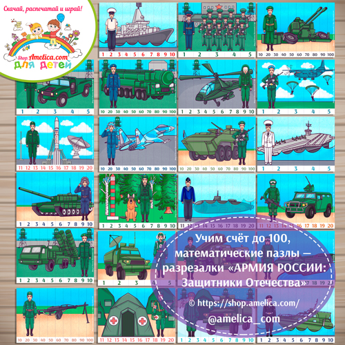 Учим счёт до 100, математические пазлы — разрезалки «АРМИЯ РОССИИ: Защитники Отечества».