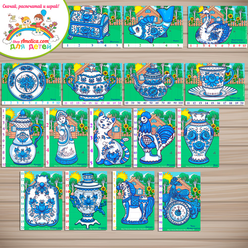 Учим счёт до 100, математические пазлы — разрезалки «Гжельская роспись (Гжель)» скачать для печати