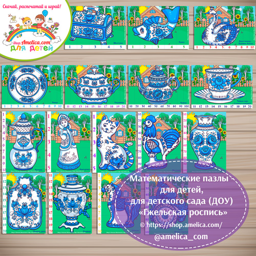 Учим счёт до 100, математические пазлы — разрезалки » Гжельская роспись (Гжель)».