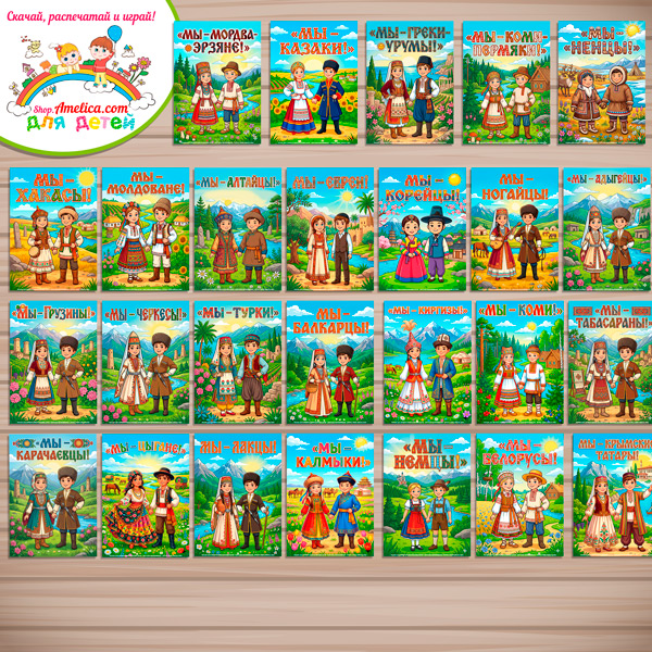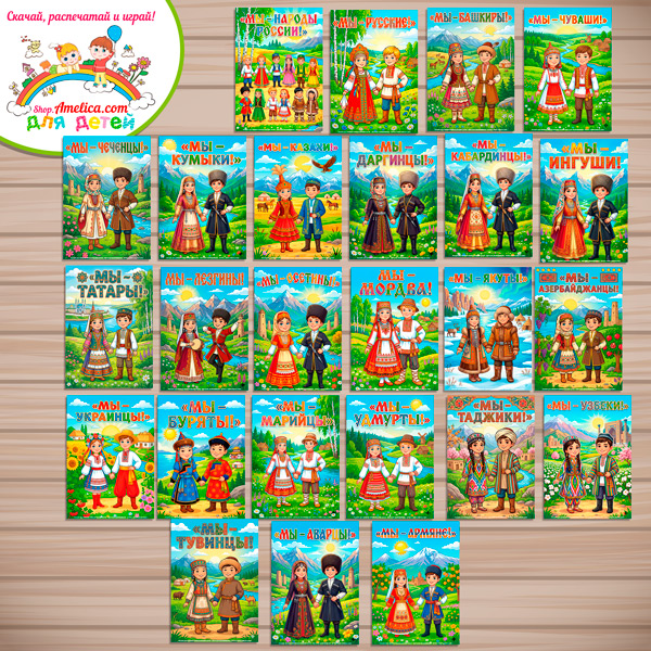 Данный набор содержит 50 плакатов формата А4 с иллюстрациями и обложку на тему — Народы России, национальный костюм, национальный состав России.
