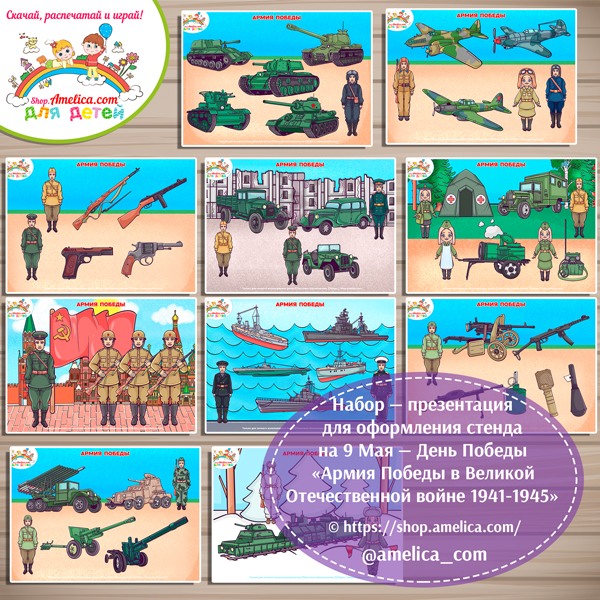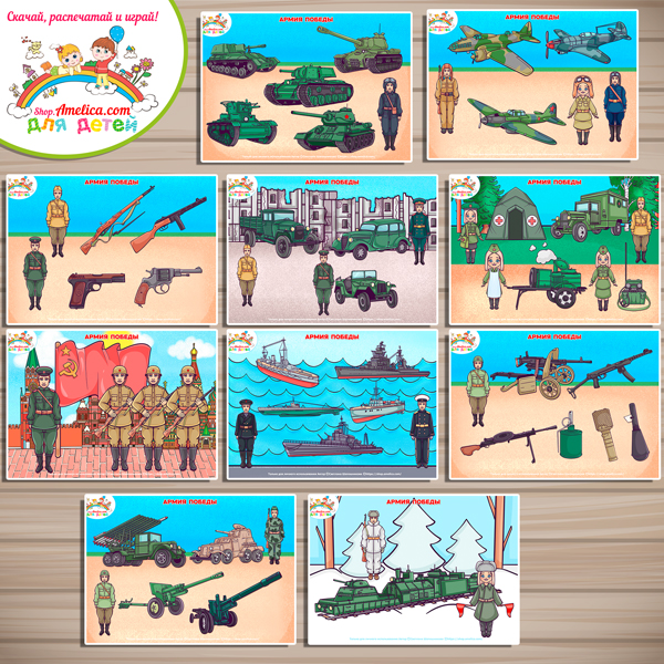 В наборе 10 иллюстраций с картинками оружия, военной техники и военнослужащих Советской армии времен Великой Отечественной Войны 1941-1945 для детей формата А4.
