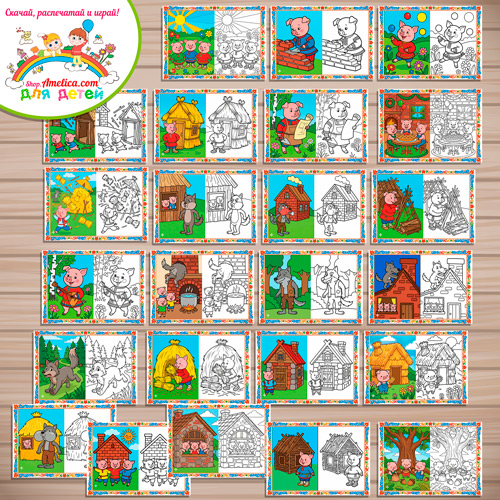 Набор — раскраски с цветным образцом для дошкольников по сказке «Три поросёнка».