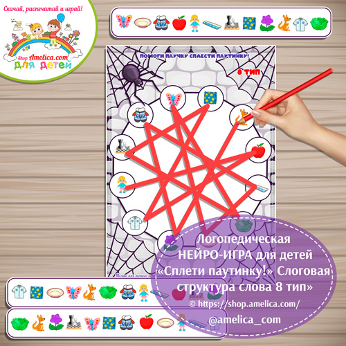 Логопедическая НЕЙРО-ИГРА для детей «Сплети паутинку!» Слоговая структура слова 8 тип — 24 слова».