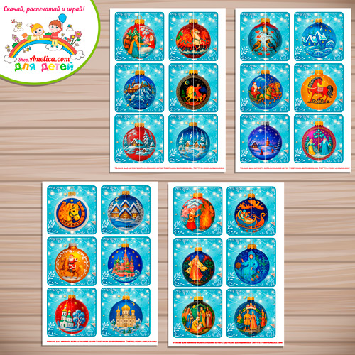 Новогодняя игра для детей «Сложи половинки новогодних шаров» шаблон скачать и распечатать