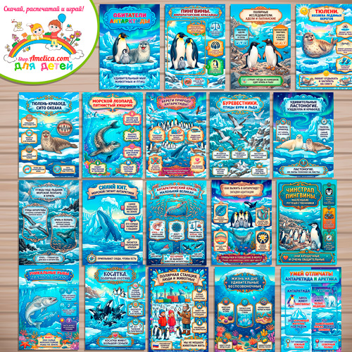 В наборе листы (плакаты): Обложка : Обитатели Антарктиды, Пингвины. Императорские красавцы, Полярные исследователи. Адели и Папуанские, Тюлени. Хозяева ледяных берегов, Удивительные ластоногие. Уэдделла и Крабоед, Птицы над льдами. Морской леопард и криль, Синий кит. Морской гигант Антарктики, Косатка. Полярный охотник, Уникальные рыбы Ледяного океана, Чинстрап Пингвины. Маленькие путешественники , Как выжить в Антарктиде? Загадки адаптации,, Антарктический криль. Маленький великан, Полярная станция. Люди и животные, Береги природу Антарктиды!, Морской леопард. Пятнистый хищник , Тюлень-крабоед. Сито океана , Буревестники. Птицы бури и льда , Жизнь на дне. Удивительные беспозвоночные, Умей отличать! Антарктида и Арктика.