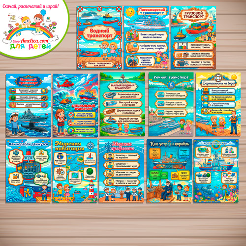 В наборе листы (плакаты): Обложка : Водный транспорт, Пассажирский транспорт. Перевозим людей, Грузовой транспорт. Перевозим грузы, Специальный транспорт. Спешим на помощь , Военный транспорт. Охраняем границы, Как устроен корабль. Основные части, Безопасность на воде. Правила поведения, Малый водный транспорт. Лодки и катера, Речной транспорт. Плаваем по рекам , Кто работает на корабле. Морские профессии, Как корабли движутся. Устройство двигателя , Морская навигация. Знаки на воде, Морской порт. Жизнь у причала, Корабли науки. Изучаем океан.