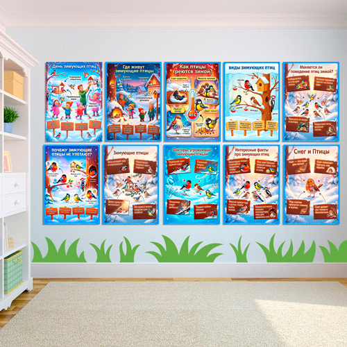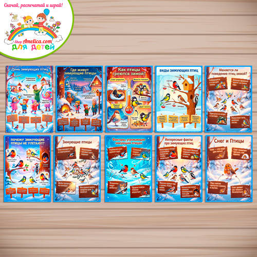 Данный набор содержит 9 плакатов формата А4 с иллюстрациями и текстом на тему — День зимующих птиц.