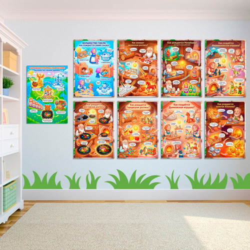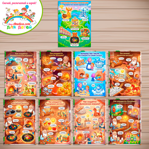 Данный набор содержит 10 плакатов формата А4 с иллюстрациями и текстом на тему — Как рождаются Русские народные промыслы, Русские народные промыслы.