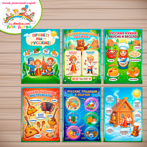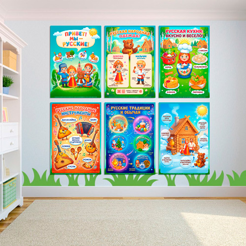 Данный набор содержит 6 плакатов формата А4 с иллюстрациями и текстом на тему — Народы России, Мы Русские, быт народа, национальный костюм, музыкальные инструменты, культурные традиции и праздники, блюда национальной кухни.