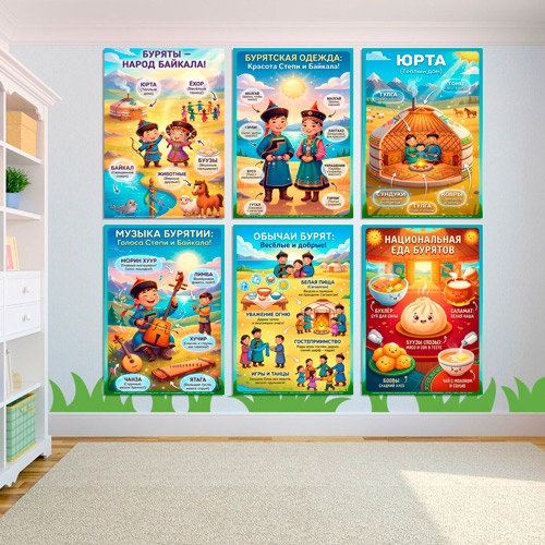 Данный набор содержит 6 плакатов формата А4 с иллюстрациями и текстом на тему — Народы России, Мы Буряты, быт народа, национальный костюм, музыкальные инструменты, культурные традиции и праздники, блюда национальной кухни.