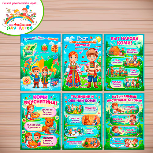 Данный набор содержит 10 плакатов формата А4 с иллюстрациями и текстом на тему — Народы России, Мы Коми, быт народа, национальный костюм, музыкальные инструменты, культурные традиции и праздники, блюда национальной кухни.