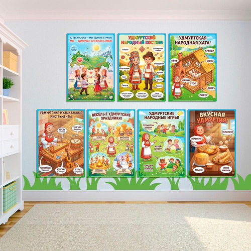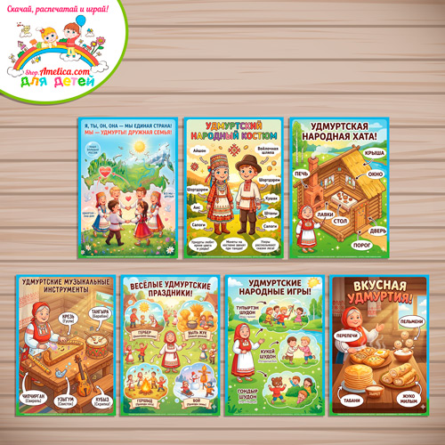 Данный набор содержит 7 плакатов формата А4 с иллюстрациями и текстом на тему — Народы России, Мы Удмурты, жилище народа, национальный костюм, музыкальные инструменты, народные праздники, народные игры, блюда национальной кухни.