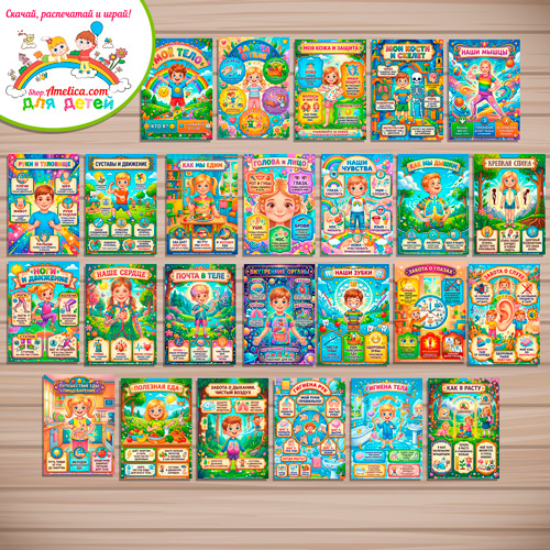 Данный набор содержит 25 плакатов формата А4 с иллюстрациями и обложку на тему — Моё тело.