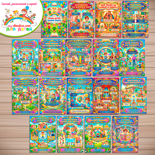 В наборе листы (плакаты): Обложка. Права детей — Важно знать!, Право на жизнь и имя, Право на семью и заботу, Право на образование и развитие , Право на здоровье и медицинскую помощь, Право на отдых и игру, Право на защиту и безопасность , Право выражать своё мнение , Все дети равны, Право на защиту и безопасность , Право выражать своё мнение, Все дети равны, Право на личные вещи и пространство, Право на приобщение к культуре и искусству , Мы уважаем права друг друга, Мои права и мои обязанности, Защита от вредной информации, Кто защищает мои права?, Право на особую заботу (если она нужна), Право на друзей и общие интересы, Я знаю свои права!
