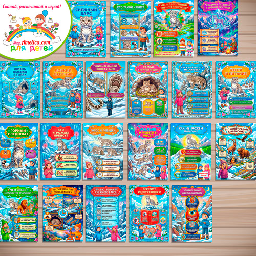 Данный набор содержит 20 плакатов формата А4 с иллюстрациями и обложку на тему — 23 октября — Международный день снежного барса, Снежный барс для детей.