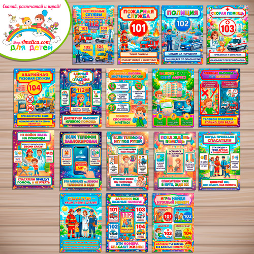 Данный набор содержит 16 плаката формата А4 с иллюстрациями и обложку на тему — Экстренные службы и телефоны для детей.