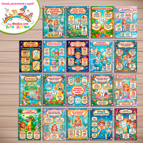 В наборе листы (плакаты): Обложка : Гигиена и здоровье зубов, Зачем нам нужны зубы, Друзья крепких зубов, Кто вредит нашим зубам, Учимся чистить зубы правильно, Вредные привычки: береги улыбку, Стоматолог — наш первый друг, Зубик заболел? Что делать, Секреты чистки рта: нить и ополаскиватель, Зубной доктор, а я и не боюсь, Здоровые десны- крепкие зубы, Прощай молочный зубик, Не забывай про язык, Моя зубная фея, секреты чистки, А как у животных, Ошибки при чистке зубов, Какие витамины любят зубы, Как ухаживать за щеткой и пастой, Я слежу за своими зубами.