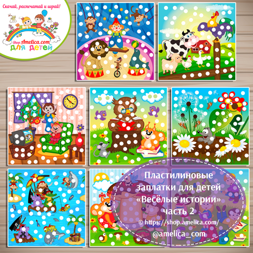 Пластилиновые заплатки — аппликации «Весёлые истории» часть 2 направлены на развитие у детей мелкой моторики, координации движений и знакомства с цветом.