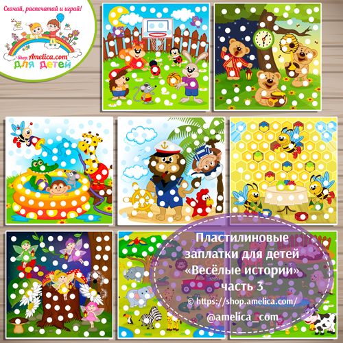Пластилиновые заплатки — аппликации «Весёлые истории» часть 3 направлены на развитие у детей мелкой моторики, координации движений и знакомства с цветом.