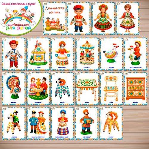 Данный набор содержит 20 карточек и обложка с иллюстрациями на тему — Дымковская игрушка