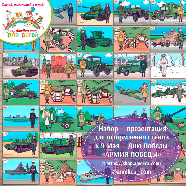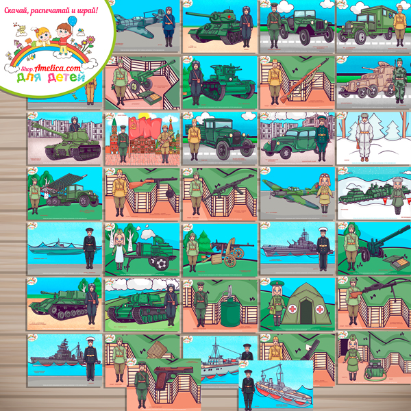 В наборе 36 иллюстраций с названиями оружия, военной техники и военнослужащих Советской армии времен Великой Отечественной Войны 1941-1945 для детей формата А4.