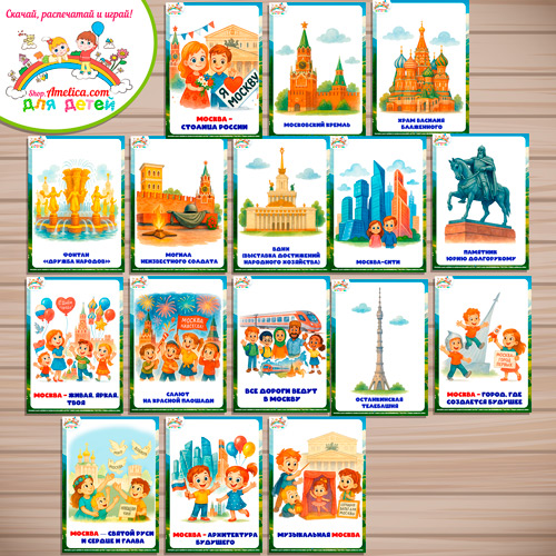Данный набор содержит 16 карточек с иллюстрациями на тему — Москва — Столица России, достопримечательности Москвы.