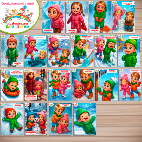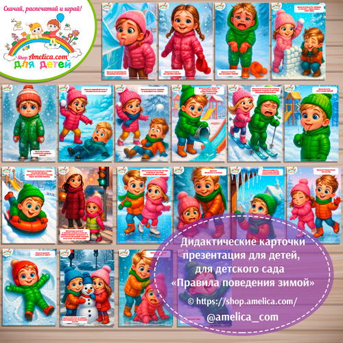 Демонстрационные карточки — презентация для оформления стенда для детского сада «Правила безопасности зимой» — 2 вариант.
