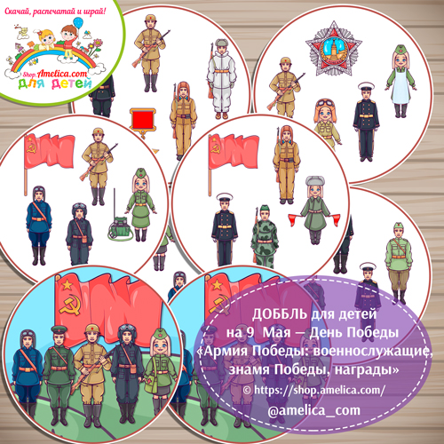 Развивающая игра ДОББЛЬ на 9 Мая — День Победы «Армия Победы: военнослужащие, знамя Победы, награды» шаблон скачать для печати