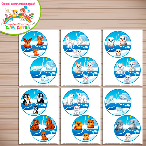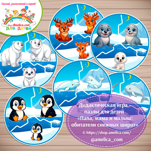 Развивающая игра — пазлы для малышей «Папа, мама и малыш — обитатели снежных широт» развивает словарный запас, внимание, память, знакомит с темой «животные снежных широт«.