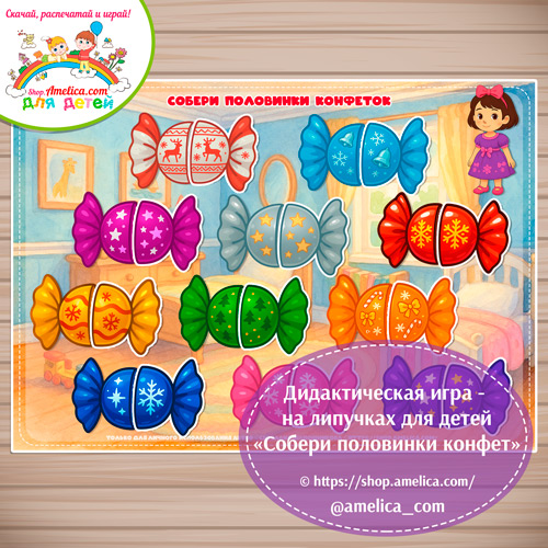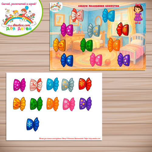 Развивающая игра для детей «Собери половинки конфеток» шаблон скачать для печати