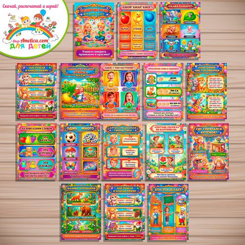 Данный набор содержит 30 плакатов формата А4 с иллюстрациями и обложку на тему — Я учусь разговаривать, развиваем речь, я учусь говорить.