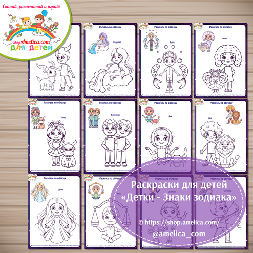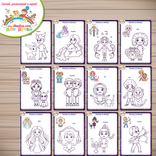 Раскраски для детей «Раскрась по образцу! Детки — Знаки зодиака!»