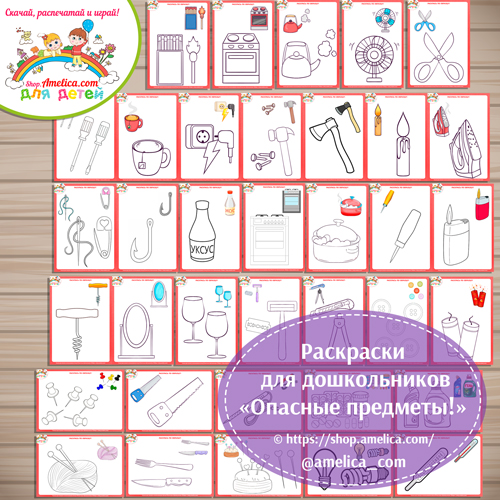 В наборе 36 раскрасок на тему: Опасные предметы.