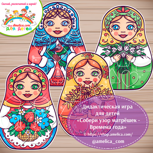Дидактическая игра «Собери узор матрёшек — Времена года» шаблон скачать и распечатать