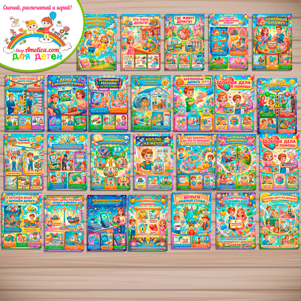 Данный набор содержит 25 плакатов формата А4 с иллюстрациями и обложку на тему — Финансовая грамотность для детей.