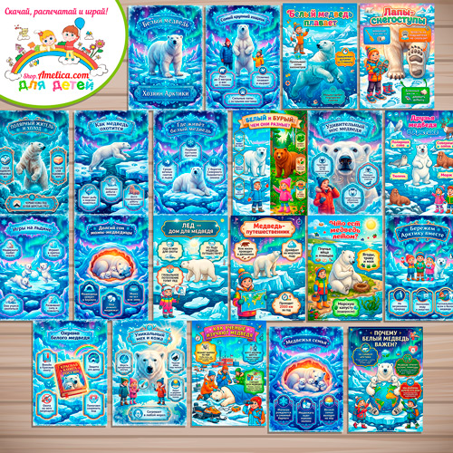 В наборе листы (плакаты): Обложка: Белый медведь – Хозяин Арктики, Самый крупный хищник, Где живёт белый медведь, Как медведь охотится, Медвежья семья, Полярный житель и холод, Долгий сон мамы-медведицы, Игры на льдине, Уникальный мех и кожа, Охрана белого медведя, Бережем Арктику вместе, Удивительный нос медведя, Лапы-снегоступы, Что ест медведь летом?, Белый медведь плавает, Медведь-путешественник, Друзья медведя в Арктике, Лед — дом для медведя, Как ученые изучают медведя, Белый и бурый: чем они разные?, Почему белый медведь важен?